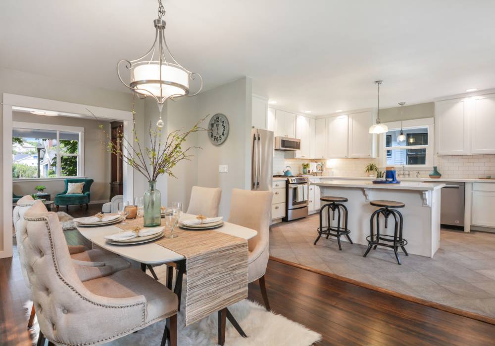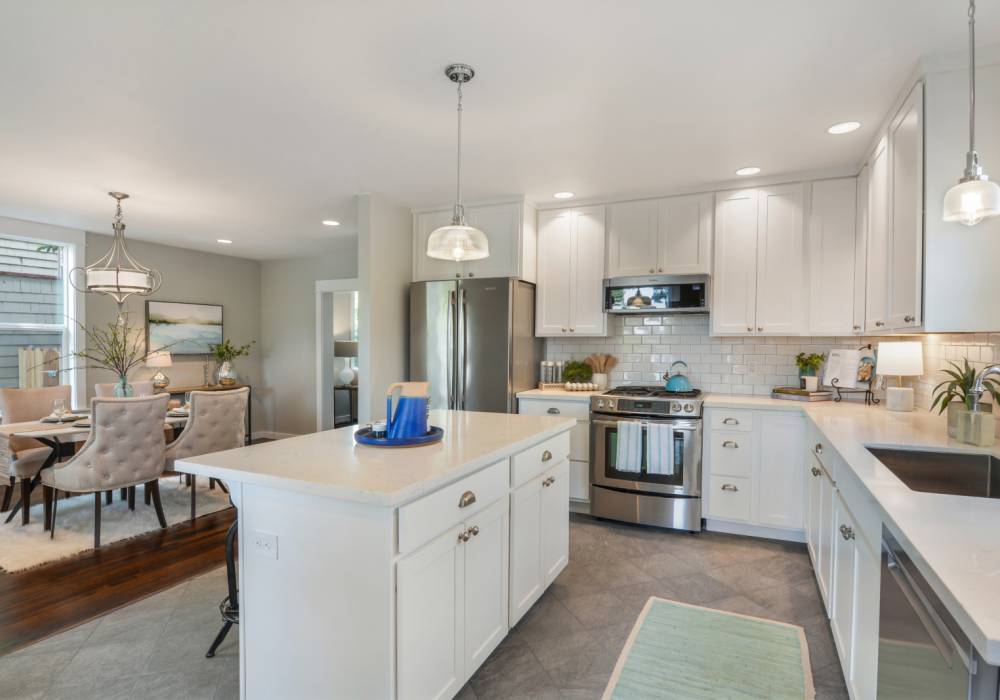 The design of the kitchen was greatly improved by opening up a wall and adding a custom window seat that overlooks the large dining area and freshly landscaped backyard. High-end appliances were installed, including a JennAir gas range and fridge. Recessed lighting, quartz counters and tile floors add functionality and style to the space.