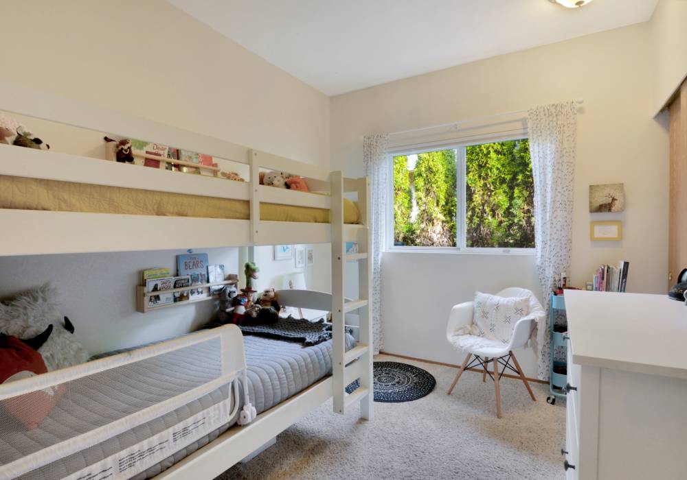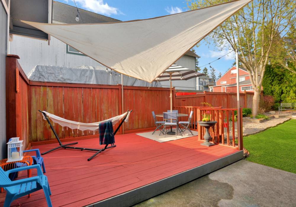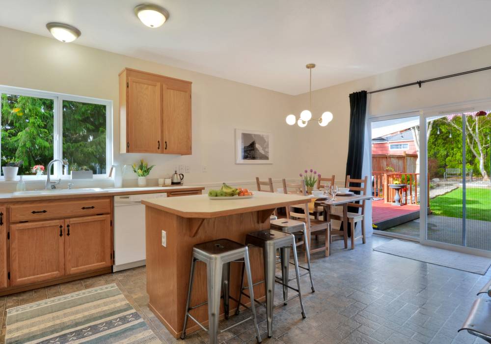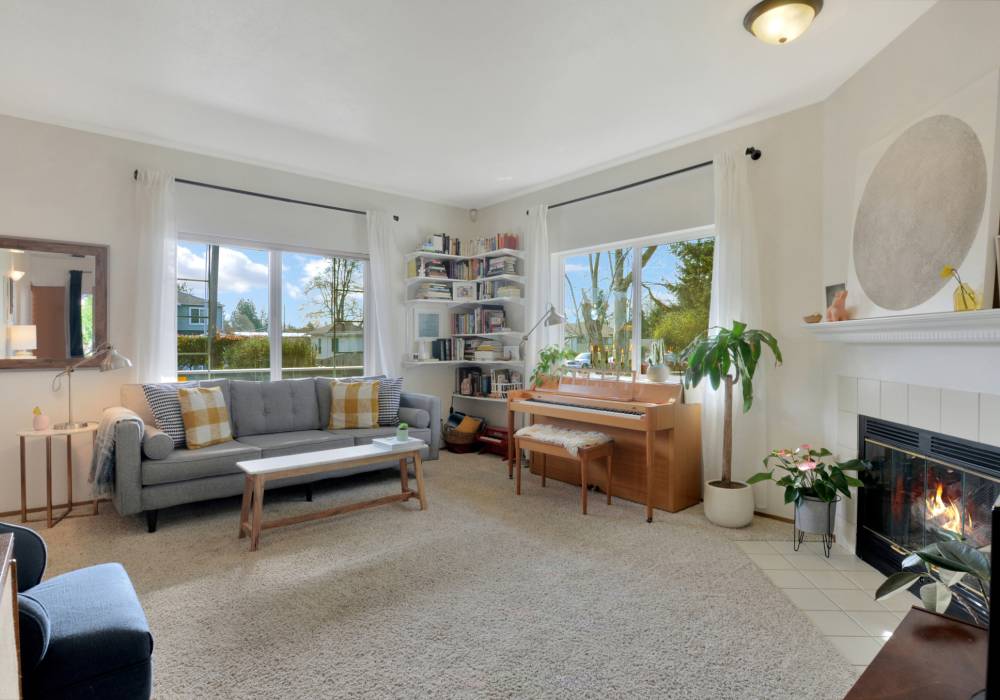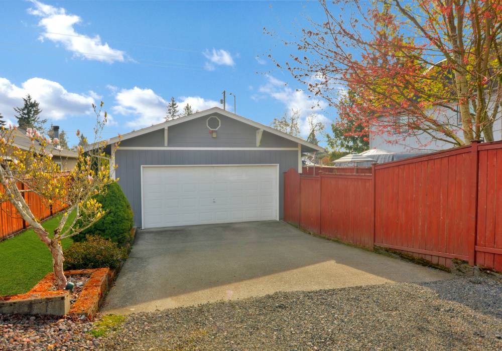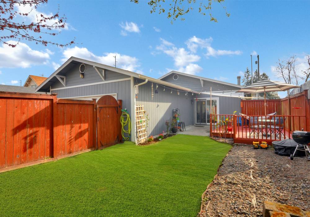 The wide covered porch and bright front door tell a true story; you’re entering a happy home. Inside, high ceilings and natural light give openness within a cozy single-level layout. Built in 1996, this bungalow features a private full bath with jetted tub in one bedroom, and a 2nd full bath in the hall. The homeowners added another window in the living room to bring in even more light, so snuggle up in the glow of the fireplace, or soak up the natural light. This home is loved for its spacious eat-in kitchen where the family hosts holiday meals for 15, also for its landscaped yard, and the flexible 3rd bedroom. In spring and summer the fully fenced back yard - with its Japanese maple, ornamental plum, and deck - becomes the dining room. An attached 2 car garage adds convenience and storage. There are even views of Mount Rainier from the south windows on clear days! Watch the sunset glow on the slopes when the mountain is out.