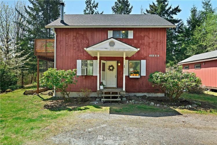 Welcome to a little piece of serenity on this 1.95 acre property. At the end of this private road you come up to a charming red two story home with a detached shop waiting for your imagination & creativity. A true rustic cabin like home that feels cozy the second you walk in. As you enter, you are greeted with a main level open concept living space, rustic wood beams, wood burning stove, newer hardwood laminate floors. Upstairs, 2 beds & main bath. Master bedroom boasts stunning wood vaulted ceilings, tons of light & new private deck to enjoy morning coffee while looking at your view. New roof & decks in 2021. Workshop was built by the owner. Feel of the country living with the convenience of the shopping district on SR410 and easy access to freeways.