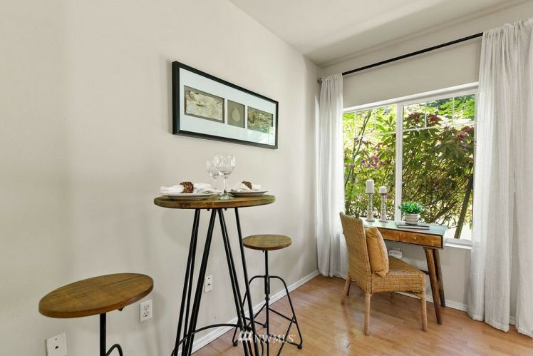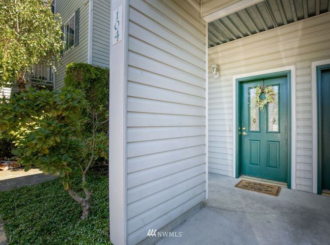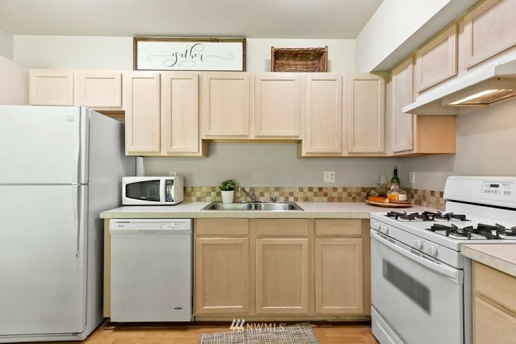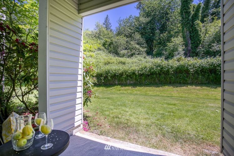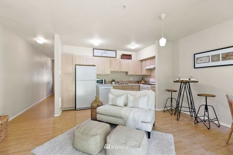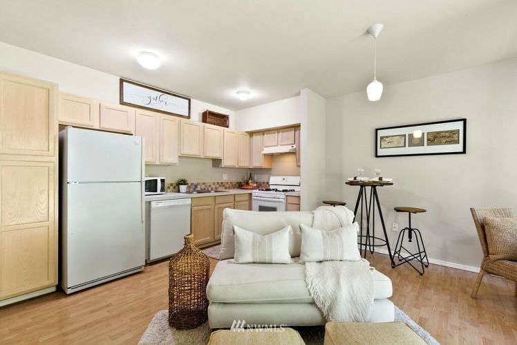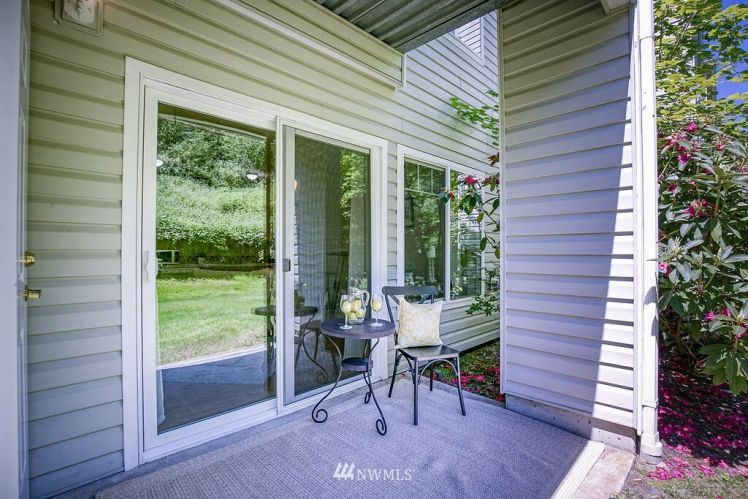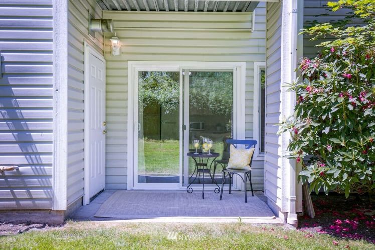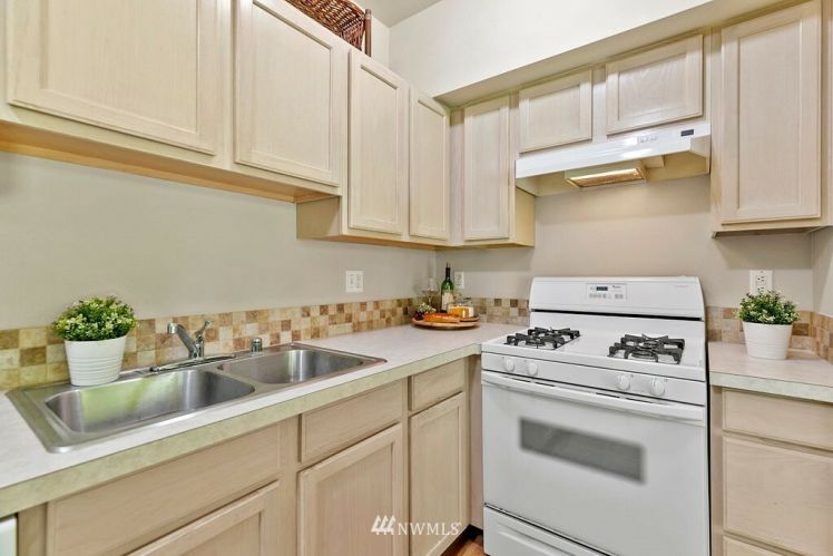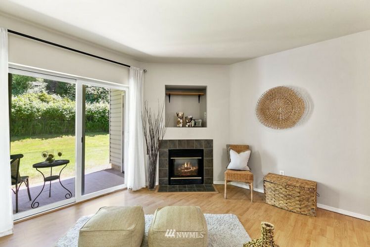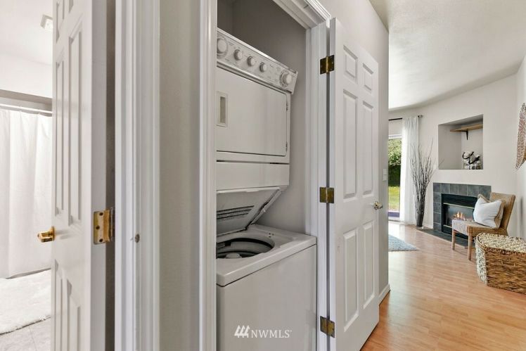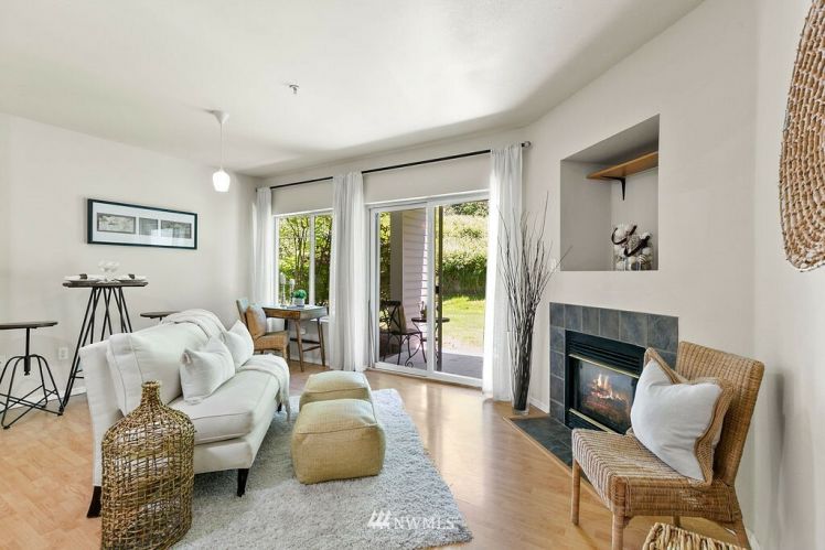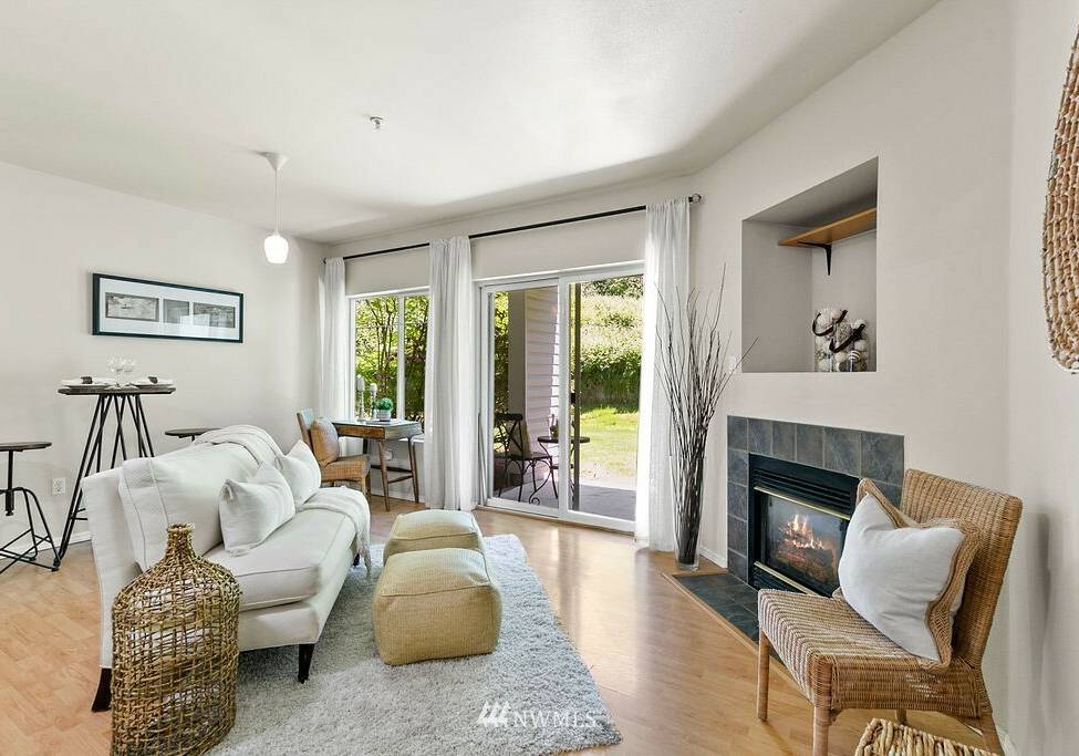 Charming, bright, cheery ground level, no steps, condo ready to move right in! Large bedroom with spacious closet, main bath connected, tall windows letting in wonderful natural light. Open concept floor plan allows ample space for dining, living & even enough room for a small home office. Cozy gas fireplace, hardwood laminate floors, stackable washer/dryer, gas oven & all other appliances included! Sliding glass doors open to your private back patio backing up to a greenbelt which adds to your privacy making for a sweet morning coffee spot. Roomy storage unit right off your own patio. Close to freeways, public transit & golf course. Move-in ready and low maintenance home for a first time home buyer or investor.