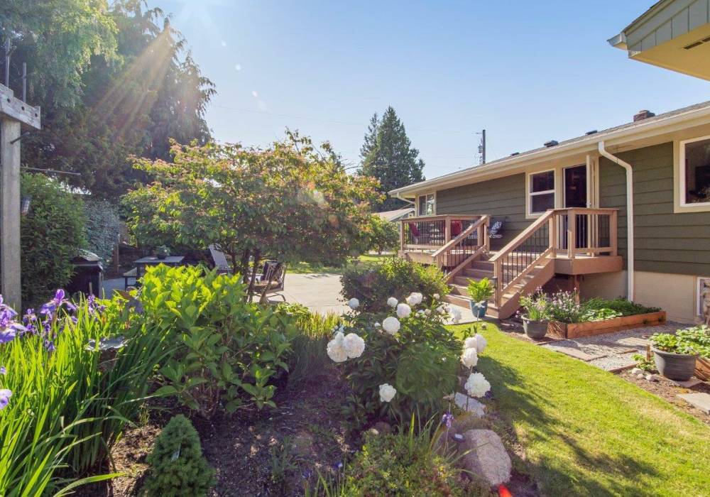“More about the yard and neighborhood that we’d like you to know about! Front yard landscaping, woolly thyme’s purple flowers (in the parking strip), rhododendrons in bloom showing the first signs of spring, harvesting blueberries and raspberries all summer long, friendly neighbors, lots of local folks out for walks stop and say hi, great sense of community”