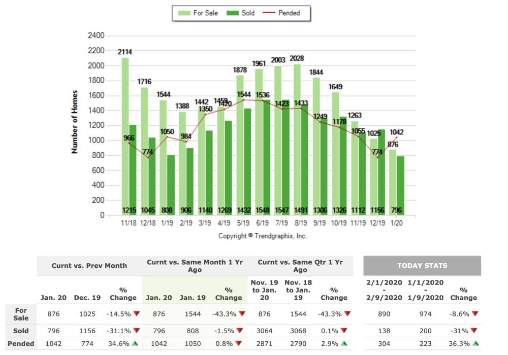 Looking at the graph, you can see both ‘for sale’ and ‘sold’ properties both went down, while pending sales went up. That is on trend with 2019, however inventory is down 43.3% from January 2019 to January 2020. There are 668 less properties this year than last year at the same time.