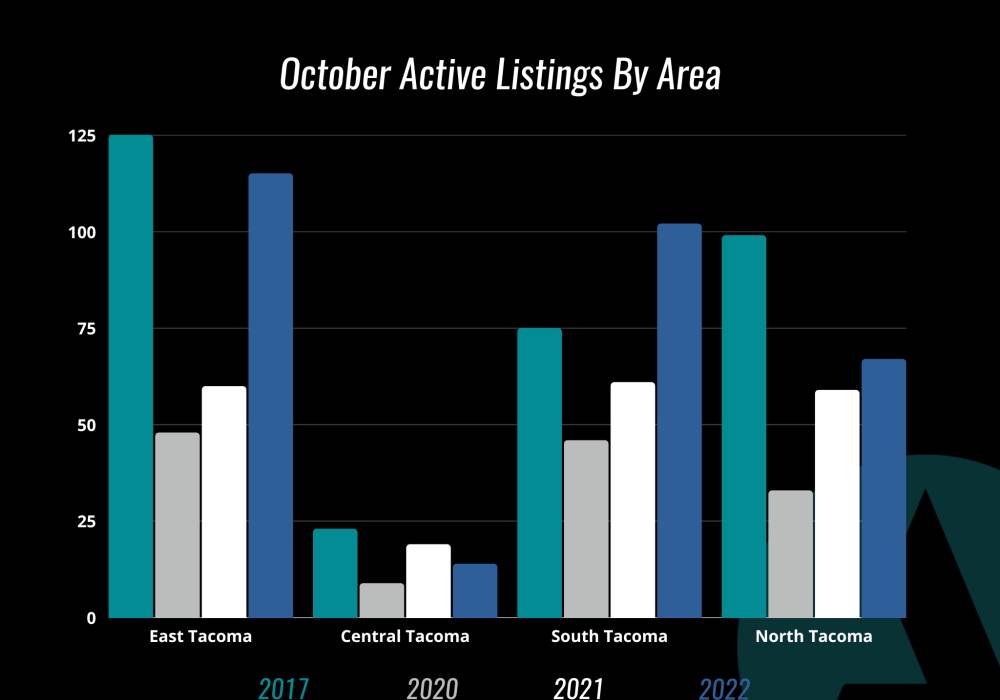 One of the fascinating findings from this graph is while Central Tacoma had the lowest number of active listings, and remained consistent, it has the highest median days on market by a wide margin. This could be due to many extenuating factors, however it could be considered an unexpected finding. South Tacoma has the lowest days on market in the current climate, however that can change based on the October market. Typically, our inventory has decreased in the 4th quarter, however this year we have seen our inventory increase and level off the last couple of months as we head to a more balanced market.