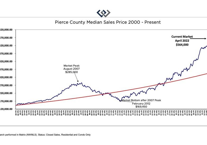 We do know that since 2012, prices for homes in Pierce County have continually increased year over year from a median price of $168,450 to $564,000 without much of an extended correction. That’s approximately a 334% increase over ten years.